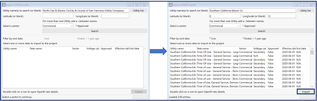 c) Then select one of the rates and click on the "Import" button on the lower right corner. This will import the tariff into the project.