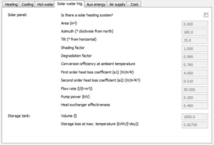 The DHW system wizard enables the definition of the delivery efficiency, storage and the secondary circulation efficiencies and pumping power. The DHW heating demand can be derived from a solar water heating system. This system will use solar power, when available, to pre-heat the water for the DHW system. A storage system can be defined for the solar water heating system.