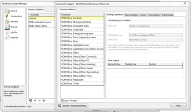 The NCM Template is unique to VE Compliance, and is used to import the NCM activity data applicable to the room. Each heated or occupied room (defined using the ‘Type of room’ setting on the ‘Building Regs’ tab) must be assigned an NCM activity. This defines the standard operation pattern of the room for the purpose of L2 (2013-2014), which is defined by attributes on the various Space Data tabs. The assignment of these Space Data attributes is effected by the NCM template corresponding to the activity.