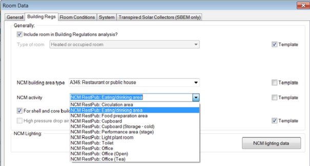 As noted above, it is recommended that the NCM activity is set as an attribute of the Room Template. This saves work as it means that the activity will be automatically set for all rooms assigned that template. An NCM activity is only meaningful in the context of a building type, so this, too, must be set in the template.