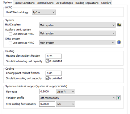 In ApacheSim, the system parameters entered here will be overridden (with one exception) in any spaces that feature in an attached ApacheHVAC system. The exception is the setting ‘Auxiliary mech. vent. system’ (which applies to the ApSys methodology). A space served by an ApacheHVAC system may also have one or more auxiliary ventilation air supplies defined on the Air Exchange tab, and for ApSys methodology rooms these are always associated with an Apache System.