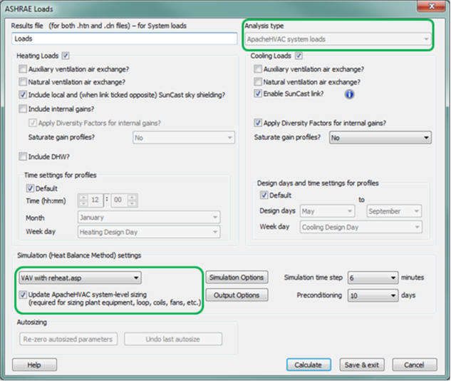 System load calculations and autosizing can be run from the System-level sizing button on the ApacheHVAC toolbar ( Figure 3-1 above), directly from within the ASHRAE Loads dialog ( Figure 6-13 below), or from the System load calculations action item in the System Prototypes & Sizing navigator. This third option is further described under in the System Prototypes & Sizing workflow navigator section below.
