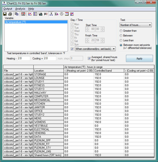 · Averaged, shared hours (for ‘unmet hours’ test): This looks at average temperature over the full one-hour period in each room for each hour and then adds any particular out-of-range hour to the total “shared hours” tally only once, regardless of how many rooms or zones were out of range during that hour. The “shared hours” total of each column is displayed in the bottom row of the table.