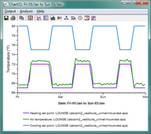 It is important to keep in mind that the heating and cooling profiles show the setpoint for occupied hours as a target for the morning start-up and after-hours operating periods. Thus you may see the room temperature lagging behind the setpoint profile, particularly in the early morning hours. The definitions below describe how unmet load hour tests use nighttime setback values while the modeled spaces are transitioning between nighttime setback and daytime setpoint. This avoids over-counting unmet hours.