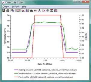 The right-hand graph shows the heating setpoint and room temperature once again with the Plant profile (red). The plant profile toggles between 0 and 1 to indicate the times during which the normal daytime setpoint should be fully met (future versions of the VE may use this profile to provide more detailed information regarding system status relative to setpoints, night-cycle operation, and so forth).