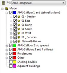 It is important to set up a Grouping Scheme in ModelIt that sorts thermal zones into groups such as System-1, -2, -3, etc. or AHU-1, -2, -3, etc. and other space types, such as Return air plenums, Solar chimney segments, Unconditioned zones, etc.