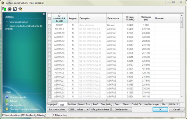 The system constructions database is a central store of constructions available for copying into projects. Materials and glazing pane types in the system constructions may also be copied. This database is accessed via the System constructions option on the View menu. You can keep the database open while you work on project constructions.