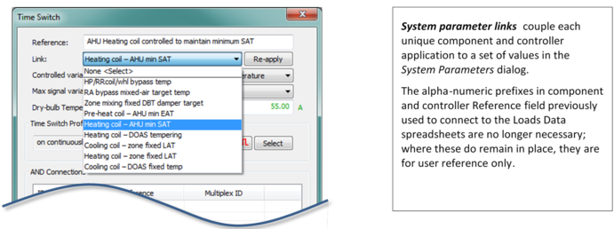 Where links are active, clicking ‘Re-apply’ will refresh the linked values within the component or controller dialog, turning them green to indicate that they have been passed down from the System Parameters dialog. A small fraction of the available links, such as those for Room/Zone components, will not be coupled to any data until associated features and capabilities are added in a subsequent release. Until then, they function only as an informative label for the component or controller. Additional links will be added over time, as part of the evolution of the complete System Parameters interface.