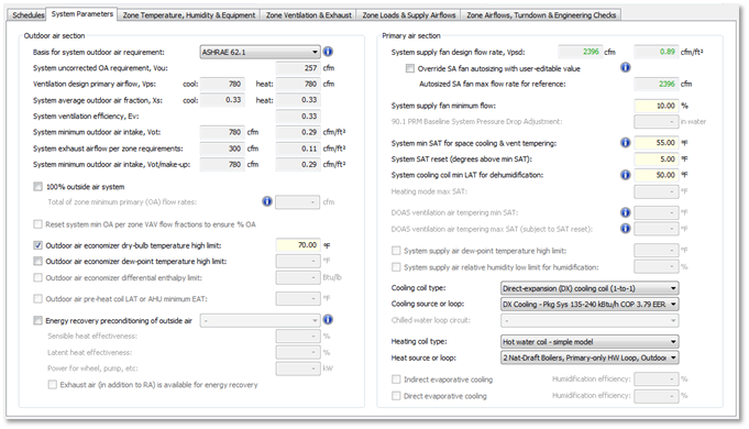 The ‘Basis for system minimum OA requirement’ is most often matched to that of all zones on the system (e.g., ASHRAE 62.1 in all cases); however, users are permitted to combine methods at zone and system levels, as is required in certain healthcare facilities and laboratories. This setting is disabled for single-zone systems.