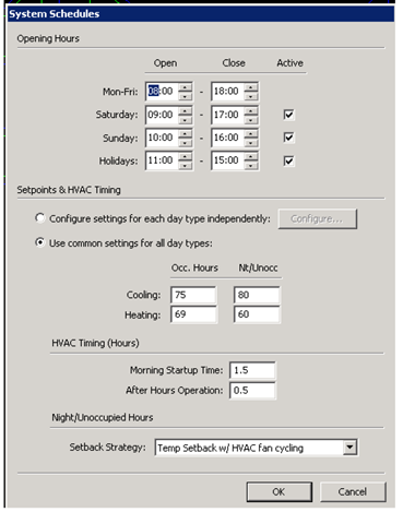 Set ApHVAC system operation schedules. When does the HVAC operate? What are the system modes?