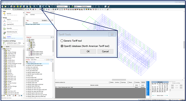 IESVE gives a user an option to either perform tariff analysis, either using a “Generic Tariff Tool” or “OpenEI database (North American Tariff Tool).” Users can select the tool they want to use by clicking on the icon in vistapro. The figure below shows the screenshot of this icon.