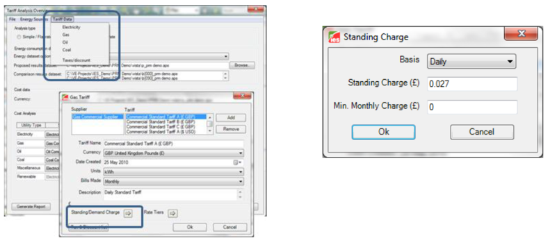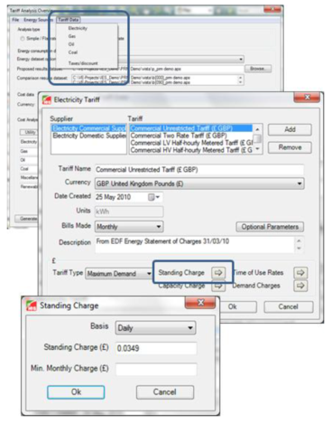Variable tariff rates allow tariffs to be set based on demand, time of day, peak values, accumulated use and more. The Tariff analysis dialog changes to show Supplier and Tariff Description in the Cost Analysis section (1).