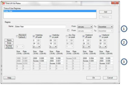 Time of Use Rate varies the cost dependant on the time of year, type of day (weekday / weekend), time of day (on-peak / off-peak) and how many units of electricity (Number of blocks) have been used.