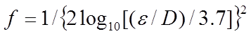 For typical flow speeds in façade cavities (i.e. Reynolds numbers greater than about 50000 and roughness factors ε/D greater than about 0.01), a good approximation to f is given by