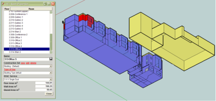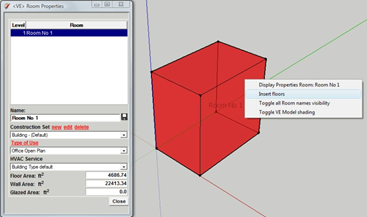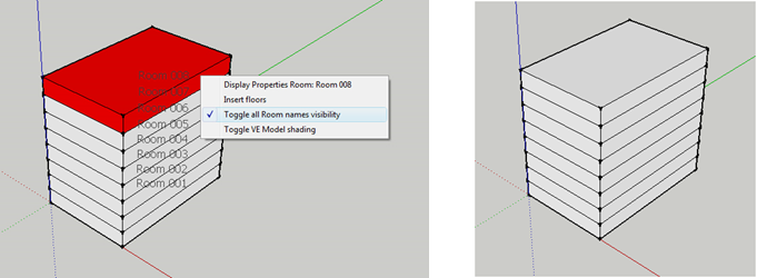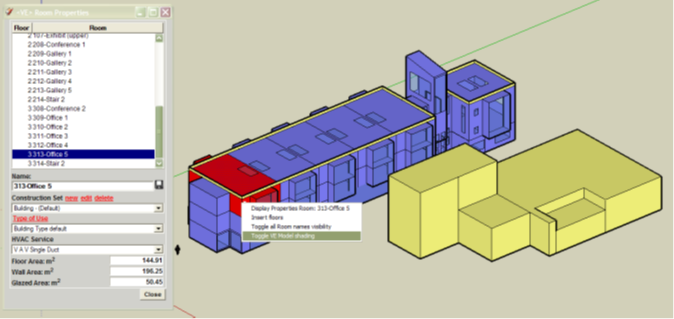 The <Virtual Environment> has a convention to describe zones that will be modelled as thermal zones, and surfaces that will be modelled as shading surfaces. Thermal zones are enclosed volumes, traditionally coloured blue in the <Virtual Environment>. Shaded surfaces are non-enclosed volumes, or single surfaces, traditionally coloured yellow in the <Virtual Environment> To be able to identify these entities in SketchUp the Toggle VE Model shading menu shows the SketchUp Model in the traditional colours of a VE Model: