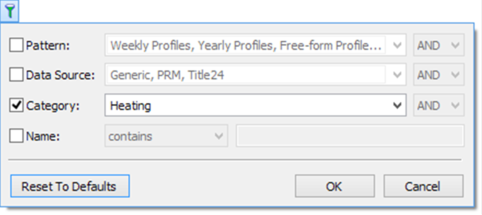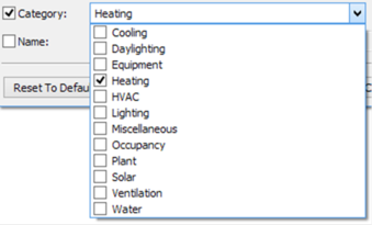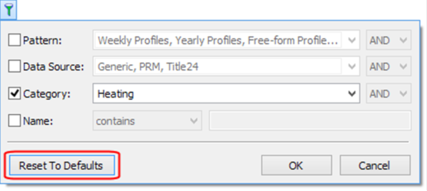 The Category filter allows you to limit the display of profiles to those with a specific category – Heating, Cooling, Plant, Equipment, and so on. These can be selected by clicking on the drop-list and clicking the checkbox next to the appropriate type:
