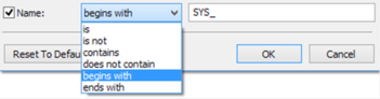 If the Name option is ticked, only profiles whose name passes the specified condition and text will be displayed (unless it has been combined with an OR condition on the preceding filter options). If no text is specified in the text field, the Name filter will not apply.