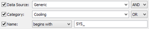 This window allows the various filtering options to be configured. There are four possible filtering types – by Pattern, by Data Source, by Category and by Name. Where two or more of these options are used, you can control how the different conditions interact by using the AND/OR logic operators. This allows you to combine filter conditions for more complex matching – for example, only show Generic data source profiles that EITHER include the category Cooling OR whose reference begins with SYS_: