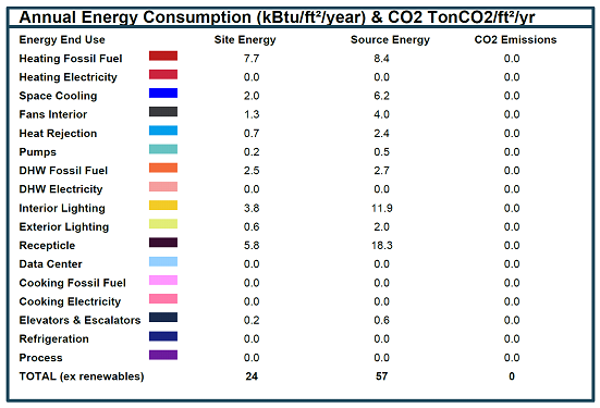 The main panel contains a table that shows the annual Site Energy, Source (primary) Energy and CO2 Emissions per units area for each end use in the model.