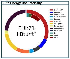 A doughnut chart is used to show the annual breakdown of energy consumption for each end use in the model. The outer doughnut shows all of the energy consumers in the model, i.e. lighting, heating, etc. The inner doughnut shows onsite energy generation such as PV, Wind, Solar Thermal or CHP.