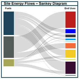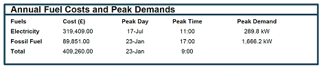 The report is designed to fit on a single page and gives a graphical summary of the energy simulation results including; Energy End Use Consumption breakdown (Site Energy, Source Energy and CO2), Annual Energy Usage dashboard, Energy Use Intensity (EUI) chart and Energy Flows Sankey, associated Costs overview and view of Peak Electricity & Fossil Fuel consumptions alongside any Generators onsite.