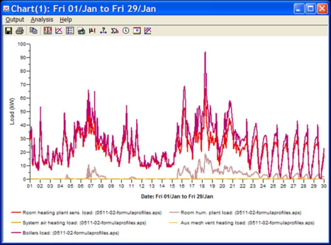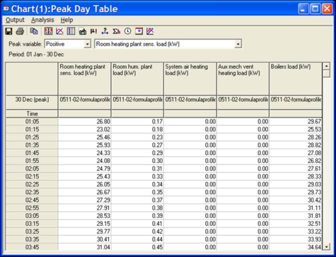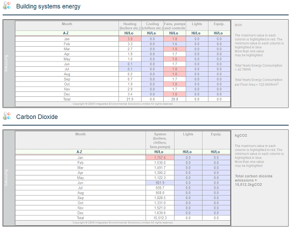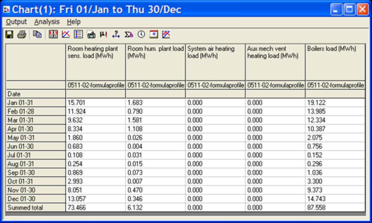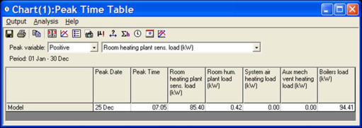 When a simulation results (*.aps) file is selected the heating and cooling report provides a monthly summary of the building systems energy consumption, CO2 consumption, basic comfort checks and peak loads breakdown.