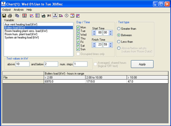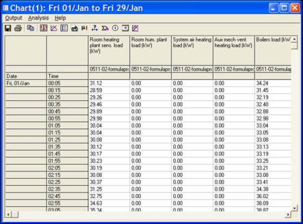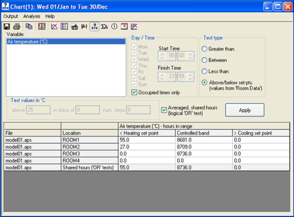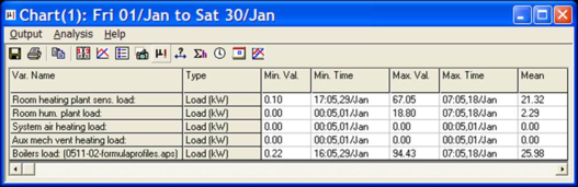 The Open File button has been described before, and is used to add sets of results. The reset cursor button acts in the same way as for ModelIT. The other buttons will generate a new chart/table and display it straight away, incorporating the currently selected variables for the currently selected parts of the building these will be explained in greater detail in later sections of this user guide.