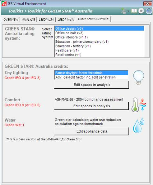 Automated indicative Green StarTM rating system credit assessment that covers daylighting, comfort and water across Office Design v3, Office As-Built v3, Office interiors v1.1, Education v1, Healthcare v1 and Retail Centre v1. Covers credits for IEQ4 – Daylighting, IEQ9 – Comfort and Wat 1 – Water