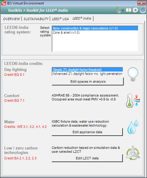 Measure building performance against indicative LEED-INDIA rating system covering credits for daylighting, comfort, water and renewables across New Construction v1.0 and Core & Shell v1.0 rating systems.