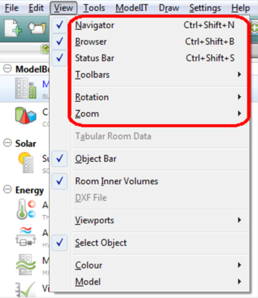 These options that are common to all applications allow you to set the toolbars to your preference and also allow you to manipulate the actual view of your model. The first four options (Navigator/Browser/Status Bar/Toolbars) allow you switch toolbars on and off.