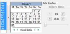 This allows you to select the date range used in charting/plotting as well as the individual time step used in visual analysis. You can select a date range using the months list or the calendar. A time step can be selected using the next/previous day/time buttons as well as the slider which can be used to easily go through the entire selected date range.
