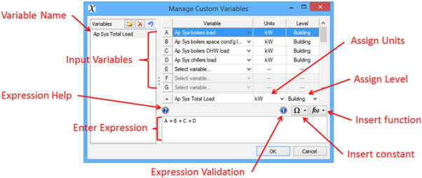 · Input variables must be from the same file. Referencing variables from different files will not produce any output. The only exception to this rule is Utility level variables, found in Utility files (*.apu), which can be used with Building level variables.