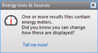 When a project (old or new) is found to contain energy meter results you will see the alert above notifying you of the fact the energy breakdown feature is available. Dismissing the alert (by closing it or clicking on the link) will stop it from showing the next time you open the project in the VE. Once you have dismissed 5 alerts you will no longer be notified of the new energy breakdown feature for any project.