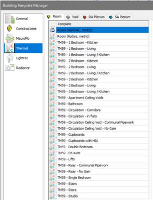 Pre-made thermal templates & profiles are provided based on TM59 requirements for rooms to be analyzed. Also provided are suggested templates for rooms not to be analyzed but are required as part of defining a complete thermal model.