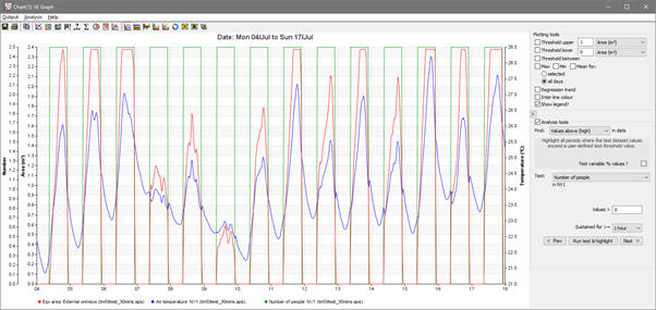 It is also useful to set detailed surface output ON for selected rooms so that the simulation results can be checked in VistaPro. For example the scripted profiles utilised in the ADO opening types (section 1.15) will show operation like this: