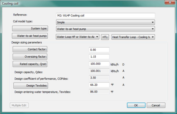 Design condition data, together with rated capacity, should be entered or edited on the WAHP ‘instance’ level, in the simple heating/cooling coil dialogs with their ‘System type’ selected as Water-to-air heat pump.