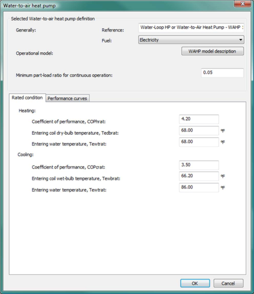 · Parameters characterizing WAHP performance are set at the ‘type’ level within the Water-to-air heat pumps (types) dialog.