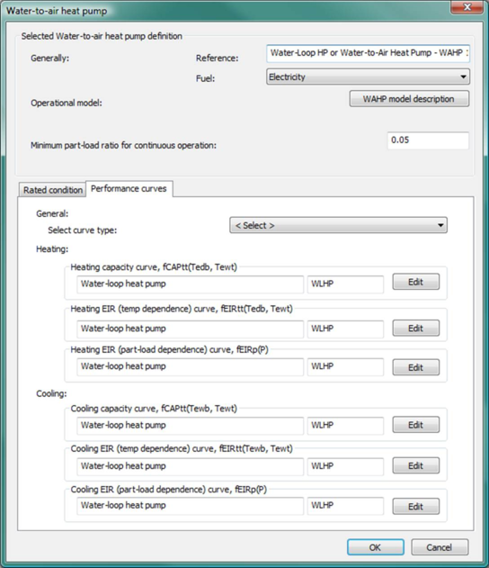 Water-to-air heat pump performance curves are selected or edited on the WAHP ‘type’ level, in the Performance curves tab of the Water-to-air heat pump dialog. There are six performance curves required, three for heating and three for cooling.