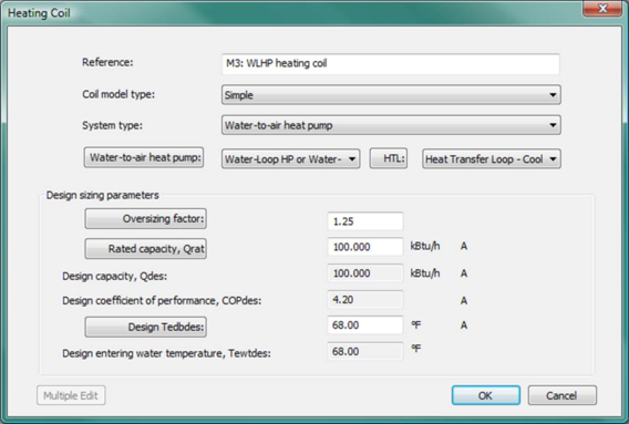 WAHP heating ‘instance’ level parameters can be edited in the simple heating coil dialog, which has a System type selected as water-to-air heat pump.