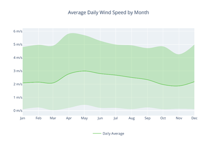 • Average Daily Wind Speed by Month: Shows mean, max, and min wind speeds