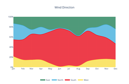 • Wind Direction: A percentage-based area chart showing the direction from which the wind blows each month