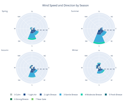• Wind Speed and Direction by Season: Uses wind roses to illustrate seasonal strength and frequency, categorized by the Beaufort scale