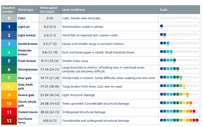 A reference table for the Beaufort scale is also provided to correlate wind speed with land conditions