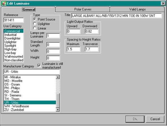 The luminaire type defines the type of lighting source and determines the calculation methods to be used by the program. Luminaire types are as follows: