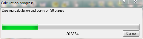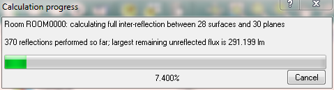 You may press the Cancel button at any time - if so you will be asked if you really wish to cancel. The screen will be updated periodically to show the latest results. This can be useful when you are performing the full progressive radiosity inter-reflection calculation. If screen refresh is taking too long on large models, try turning this off by pressing the Hide lighting levels button on the toolbar.