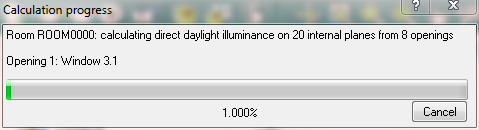 Step through the Wizard, entering values as shown on the diagrams. If you wish you may turn on “Full inter-reflections” in the Advanced quality settings dialogue, Reflections tab. Press Finish. The calculations then proceed. At each phase the Progress dialogue box will show the progress.