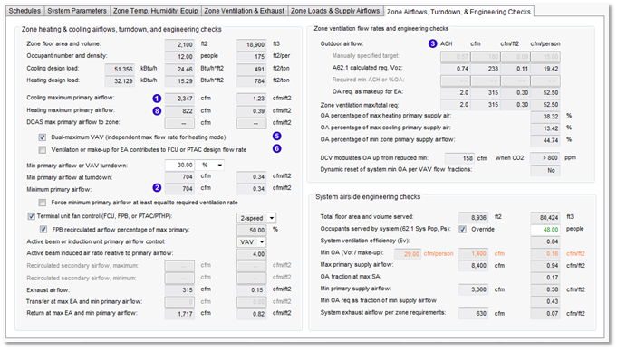In PTACs, PTHPs, and DOAS systems where Fan-Coil Units or similar recirculate zone air for space conditioning, the word “primary” is omitted, and this parameter is simply “Cooling maximum airflow.” For all DOAS systems, the “DOAS max primary airflow to zone” parameter immediately below is the relevant primary airflow.